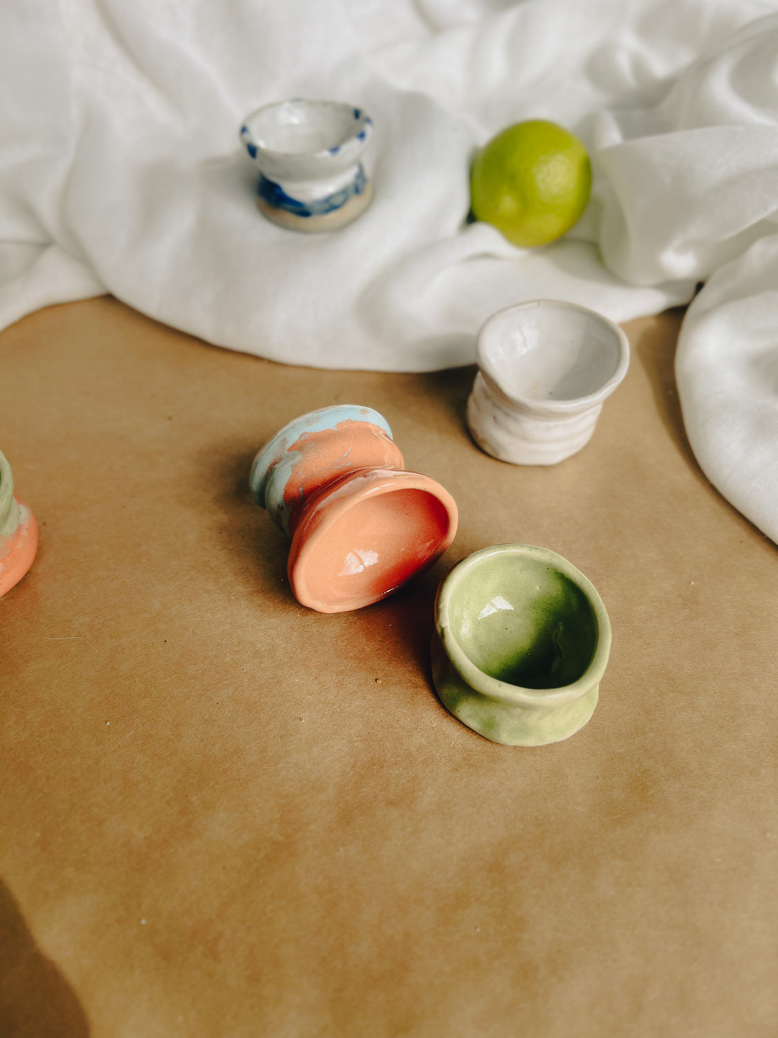 Uniquely shaped to reflect the imagination of their makers while keeping full functionality, each piece is one of a kind, hand-thrown from 100% natural clay and finished with a marmoreal glaze in contrasting natural tones by the Klipoh Artisans.