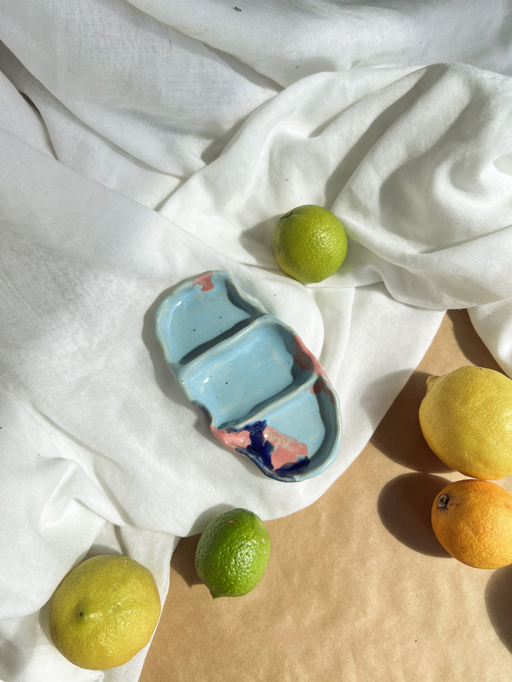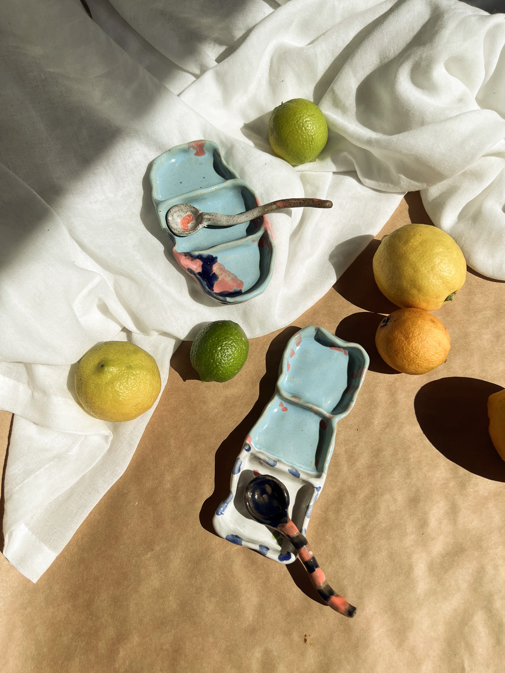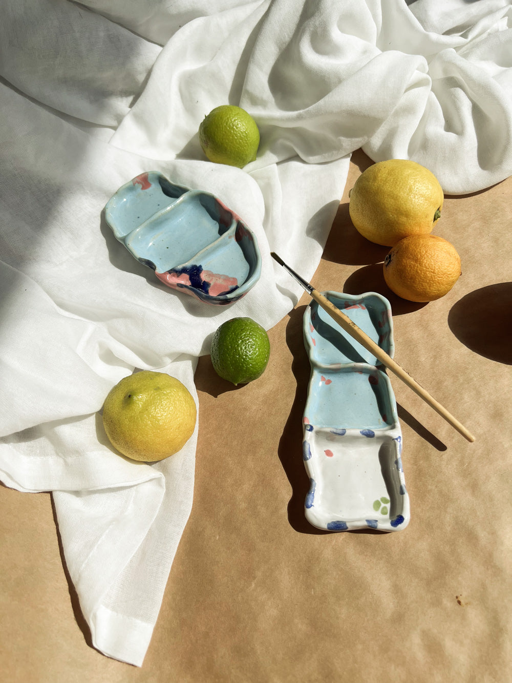 Each tray is hand-thrown and finished with a hand-painted glaze, making every piece unique in tone and texture. Available in a range of colours to complement your kitchen or living space.