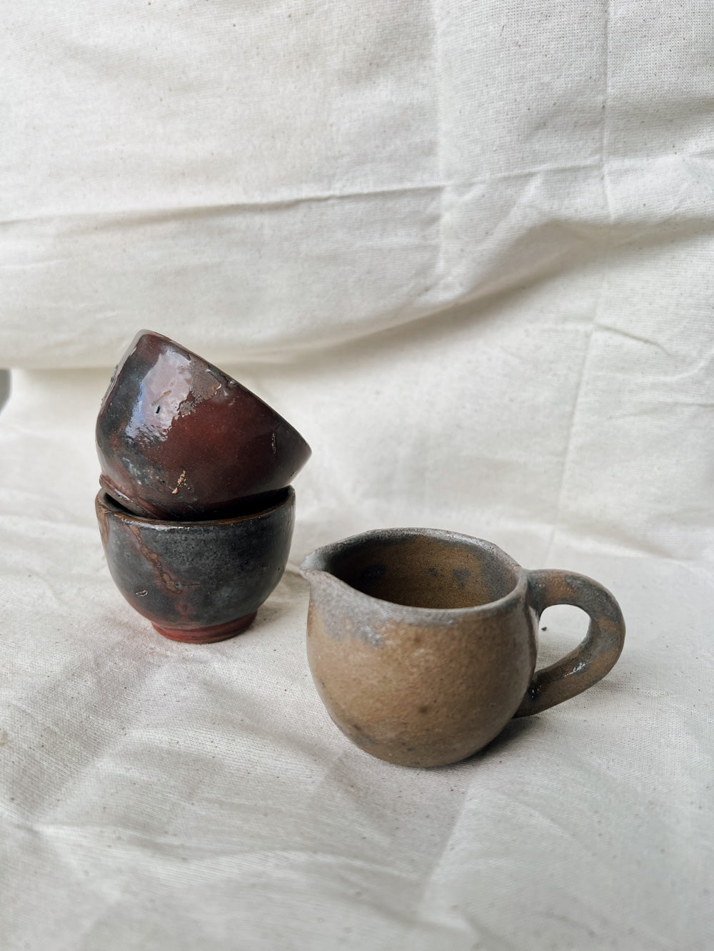 The Tia Trio includes two handmade mini shot cups and a matching milk jug, crafted by the Klipoh Artisans from 100% natural clay.