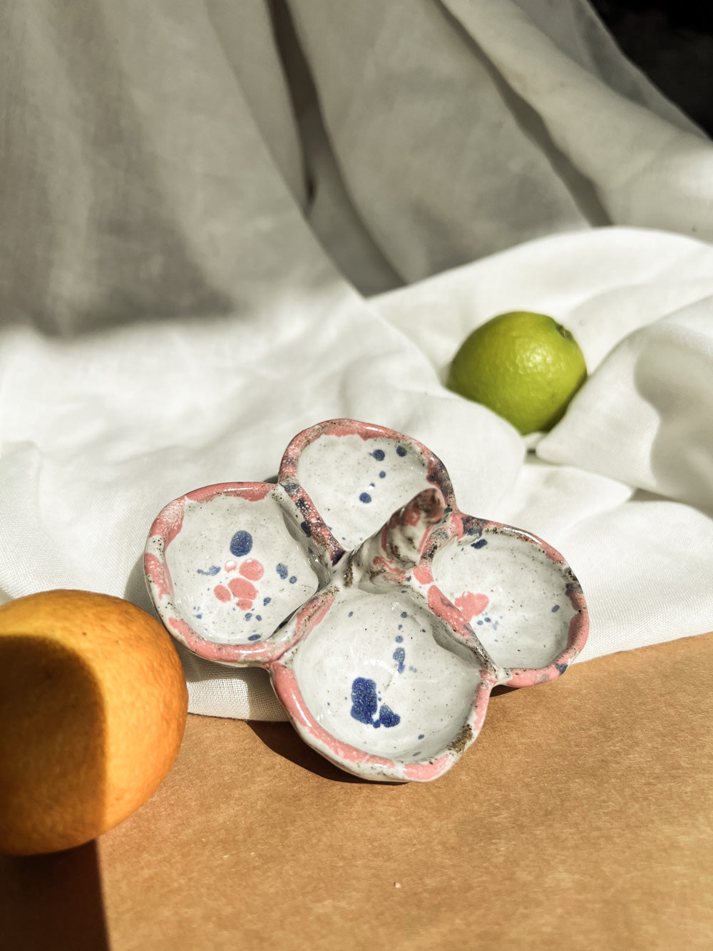 Approximately 10 cm (L) x 10-15 cm (W) in size, with 4 compartments / glazed finish.