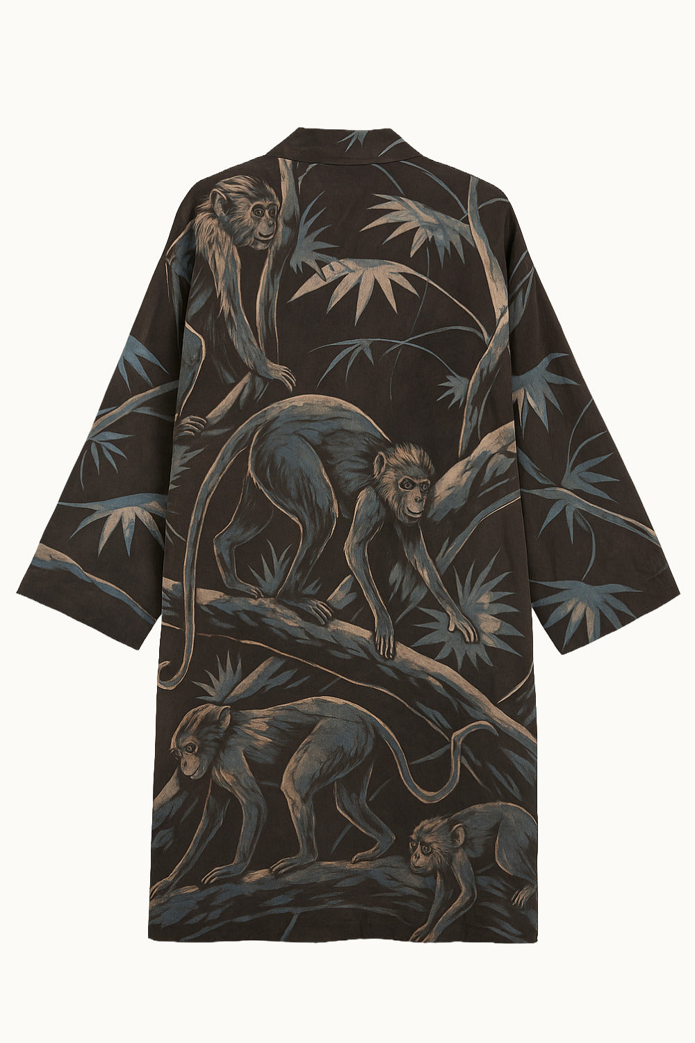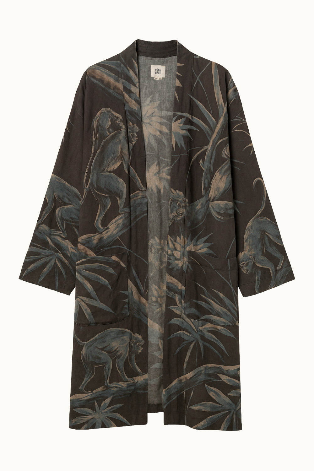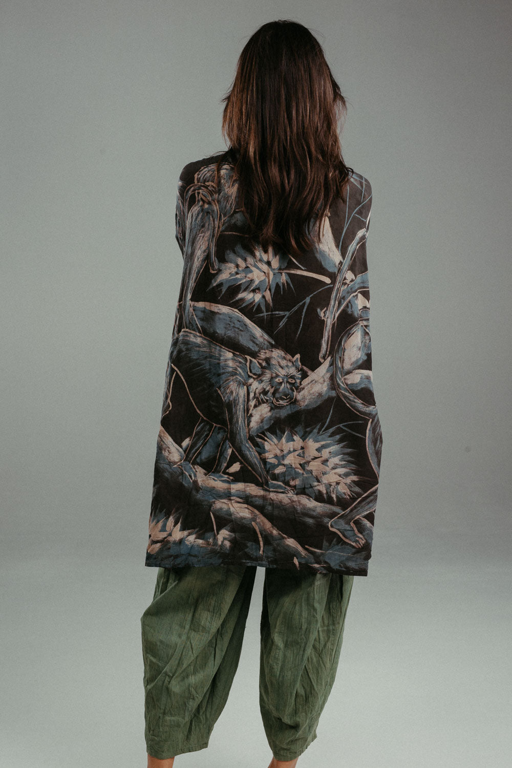 Model is 175cm / 5ft 9in. and wears a size OS. This straight-cut kimono is tailored to an oversized unisex fit.