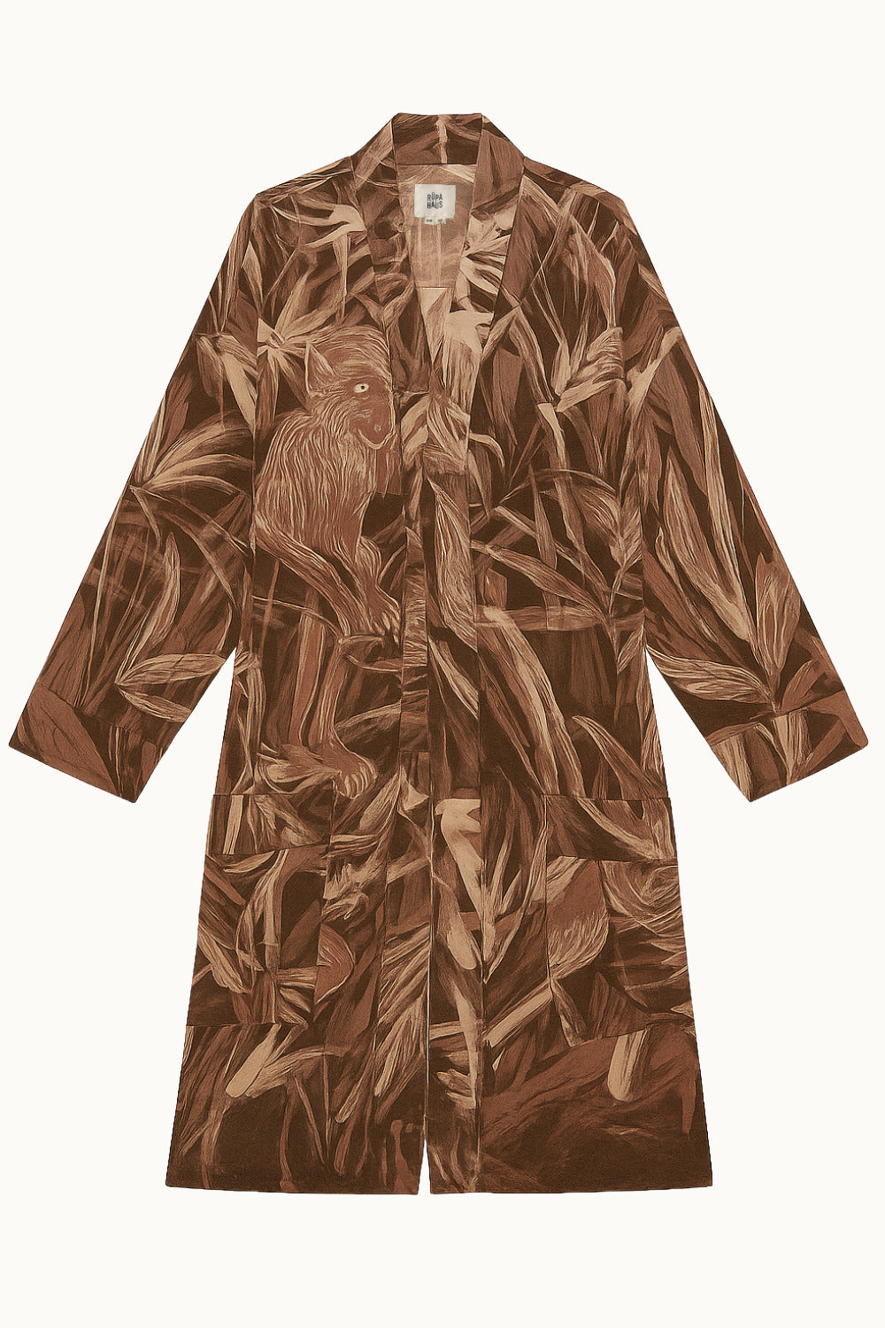 Model is 175cm / 5ft 9in. and wears a size OS. This straight-cut kimono is tailored to an oversized unisex fit.