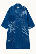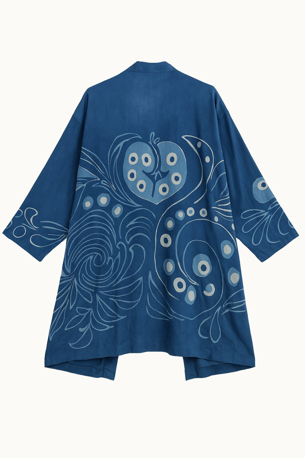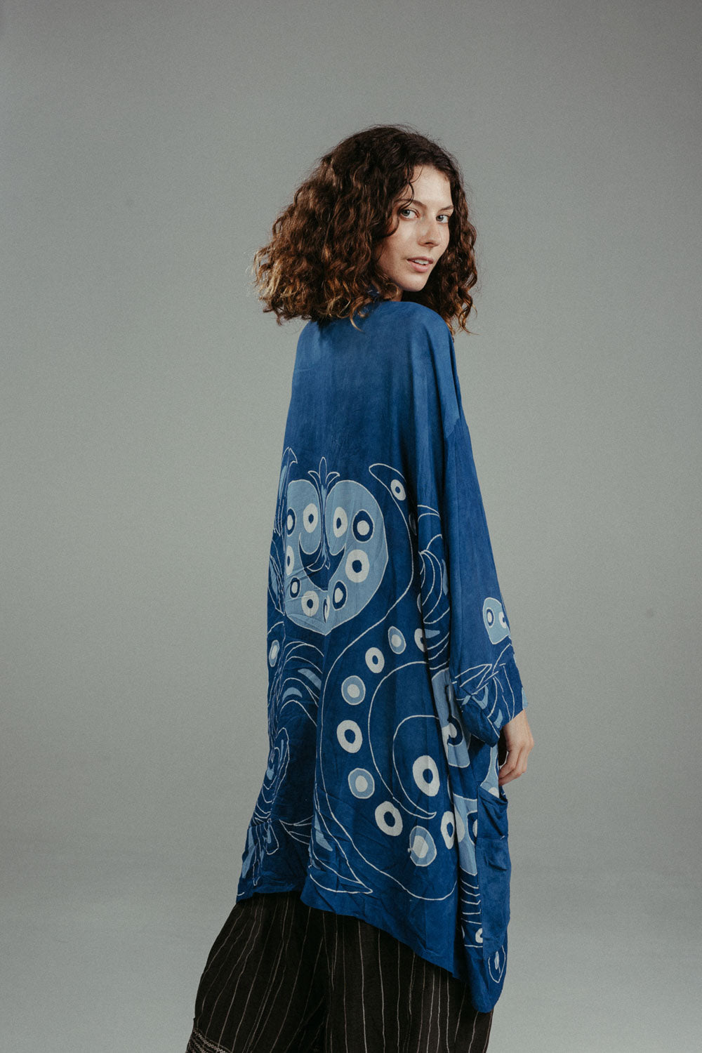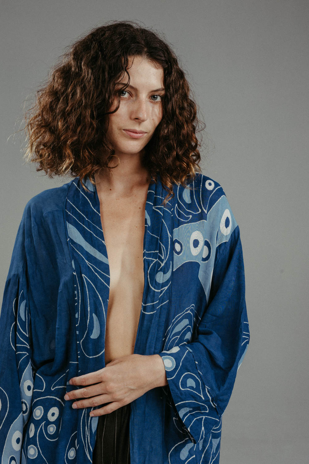 Each Gala kimono is intricately hand-drawn using the traditional technique of wax-resist dyeing, a process that transforms fabric into a wearable canvas of vibrant stories.