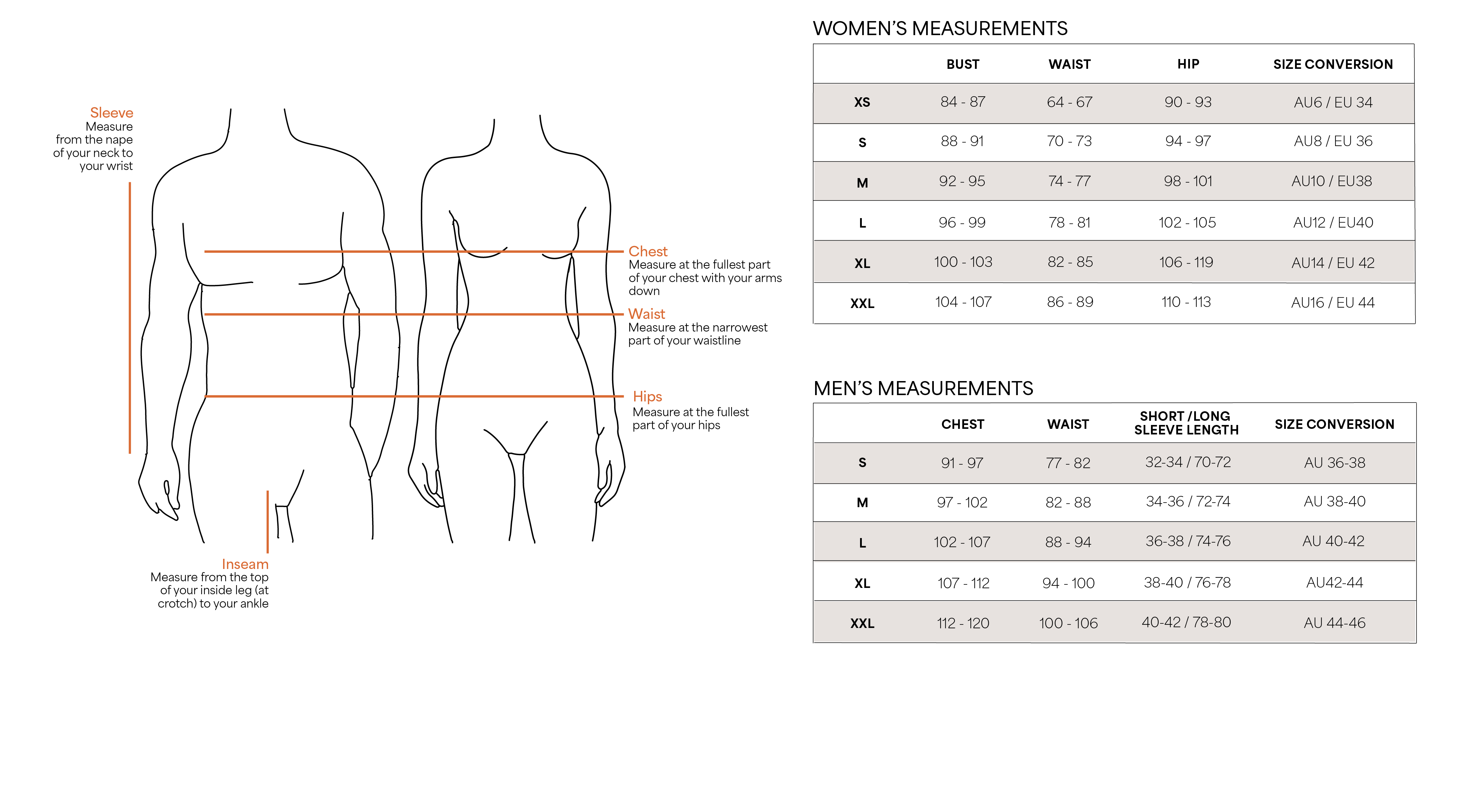 Use the measurements below as a size guide to help you find the best fit for the body. All measurements are body measurements in centimetres.